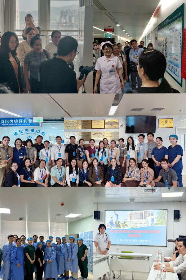 在为期四天的交流活动中,老挝玛霍索医院代表团参观了湘雅三医院和湘雅医学院新校区,并深入到医院眼科、临床技能培训中心、门诊、消化内镜中心、日间手术中心、儿童保健中心、乳甲病房等科室进行观摩学习。在眼科,代表团详细了解了眼科的专科建设及其与全身性疾病的关系,并亲身体验了全方位眼球扫视项目;在临床技能中心,代表团聆听了“医学模拟教学的发展和应用”主题讲座,并沉浸式参与了基础生命支持课程;在门诊,代表团询问了门诊诊疗流程和医院整体运营情况;在消化内镜中心,代表团观摩了体外震波碎石、ERCP及内镜清洗消毒等细节操作;在日间手术中心,他们全面了解了日间手术的病种选择和手术方式;在儿童保健中心,代表团亲身感受了融预防、医疗、保健、教育为一体的先进儿保服务模式;在乳甲外科,代表团详细了解了乳腺康复的专科特色,包括淋巴水肿、全病程管理和心理疗愈等方面。