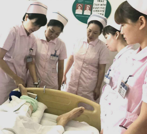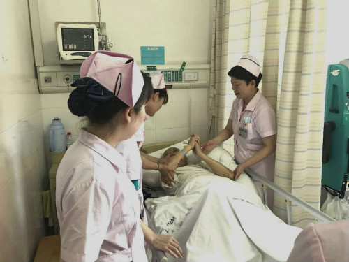 责任护士周正容以PPT的形式进行了病例汇报,杨艳护士长对患者进行GCS评估、肌力评估等护理查体,并为防止肢体废用综合征的发生,对偏瘫肢体的摆放、具体康复项目以及频次、时机进行了专业指导。成湘红护士长就患者的翻身技巧以及患侧肢体的牵引要求做了现场示范,她强调规范的翻身法不仅能避免骨折患者翻身引起的疼痛,还能减少股骨颈部活动,防止造成股骨颈部位的再移位。