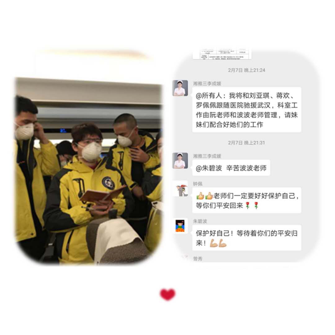 春节期间,是你值守病房,没休息过一天。医院开放发热门诊,也是你第一个报名,并立即响应医院号召,紧急抽调了两名护士支援急诊。但是你又担心我们会遇到新冠患者,时刻提醒我们保护好自己。2月7日,支援武汉的通知下来了,你又是早早报名,作为一名临床工作者,你应该比任何人都清楚此行的风险和挑战,但没有丝毫犹豫,你毅然出征,带着科里三位护士成为了第一批援助武汉的人员。没有太多的辞藻,只是简短的在姐妹群里进行通知,仿佛这只是一次常规的业务学习。到了武汉,你又成为了这个新集体的组长,细致的安排小组工作,像个陀螺一样,在这场战役中不停的转。我们都知道,除非我们打赢了这场仗,否则你将一直转下去。