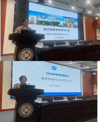 中华护理学会重症专科护士、内科ICU朱素翠,急救专科护士、急诊科梁力分别作学习汇报。梁力重点介绍了首都医科大学附属朝阳医院和北京积水潭医院急诊群体伤救治、标准化分级转运、病区精细化管理等安全管理方面亮点;朱素翠介绍了首都医科大学附属朝阳医院和中日友好医院在呼吸治疗、ICU早期康复、院感防控、VTE预防、教学培训等方面的特色。