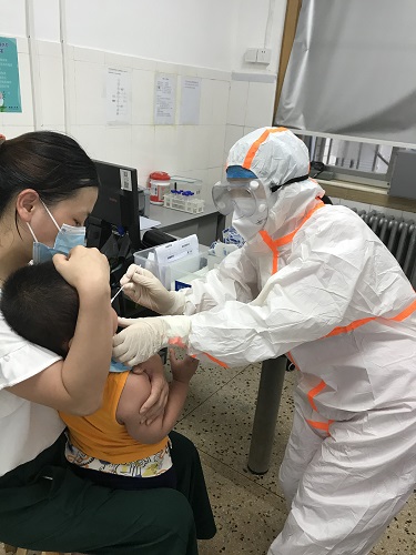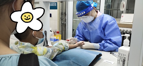 虽然酷暑难耐,但同事们依然主动请缨,纷纷献身疫情防控工作。大家在每个环节都高度认真负责,毫不松懈、不厌其烦地反复核查每一位就诊患儿及陪人的行程码、健康码,测量体温、询问流行病学史,快速鉴别、分诊普通和特殊发热患者。为了减少患儿痛苦和就诊等待时间,为了提供更优质的护理服务,医护人员主动前往检验科,进行手指血采集的学习,并通过以自己为样本、同事之间相互练习等方式,提高操作水平。面对患儿家属出现焦虑、恐惧、烦躁情绪时,及时耐心解释和疏导。忙碌的工作使的大家顾不上喝水吃饭、上厕所,尽管脸上多了一道道勒痕,衣服被厚厚的隔离服防护服浸湿,大家也从不叫苦叫累,一直默默坚守着。