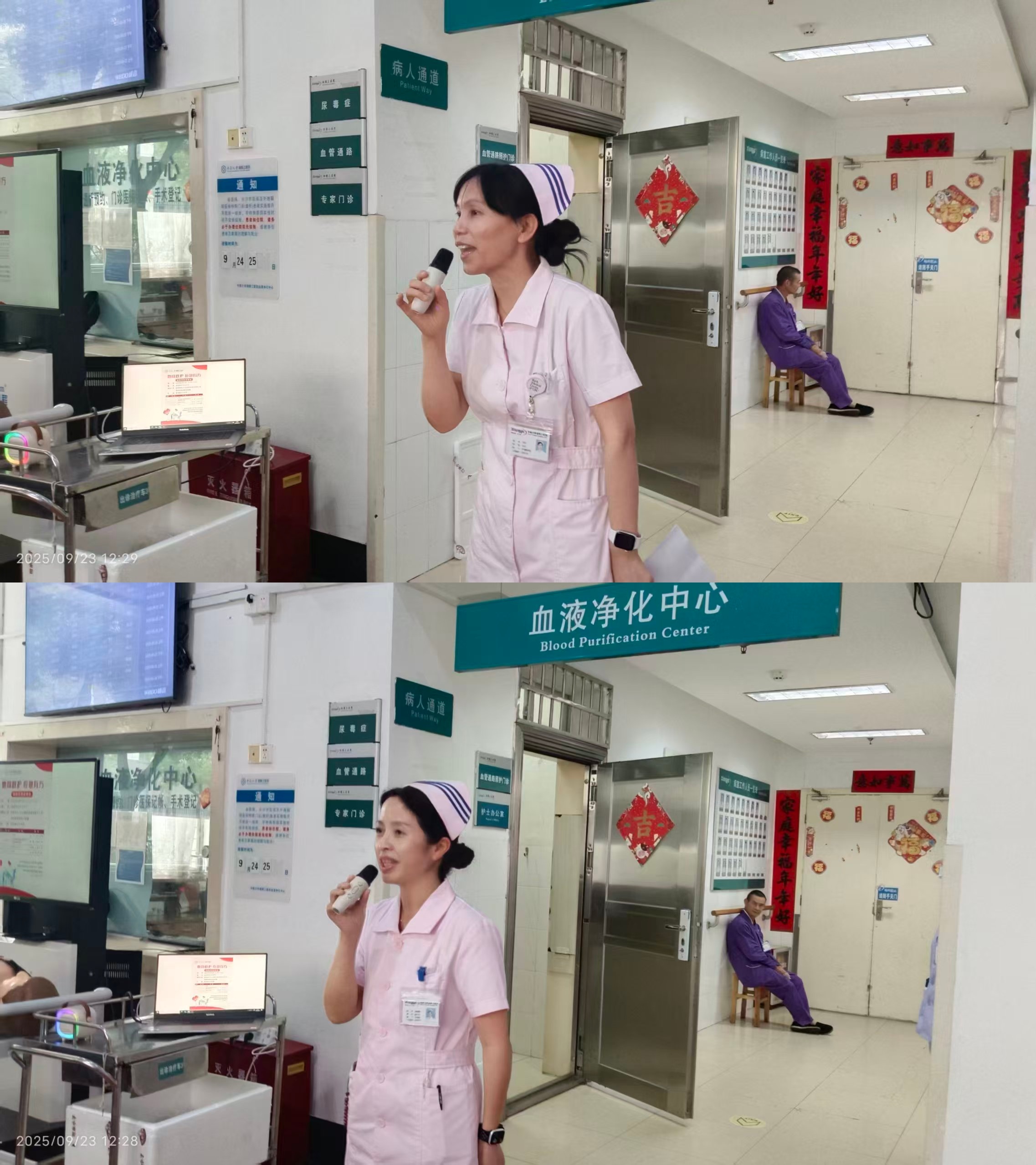 肾内科病区护士长周晴作《血液透析患者护理要点与居家急救攻略》专题讲座。她从透析患者日常饮食、液体管理、血管通路维护等细节出发,深入浅出讲解了血液透析患者的居家护理关键要点,并结合常见紧急情况提供了清晰实用的急救操作指导。讲座内容贴近患者实际需求,现场反响热烈。