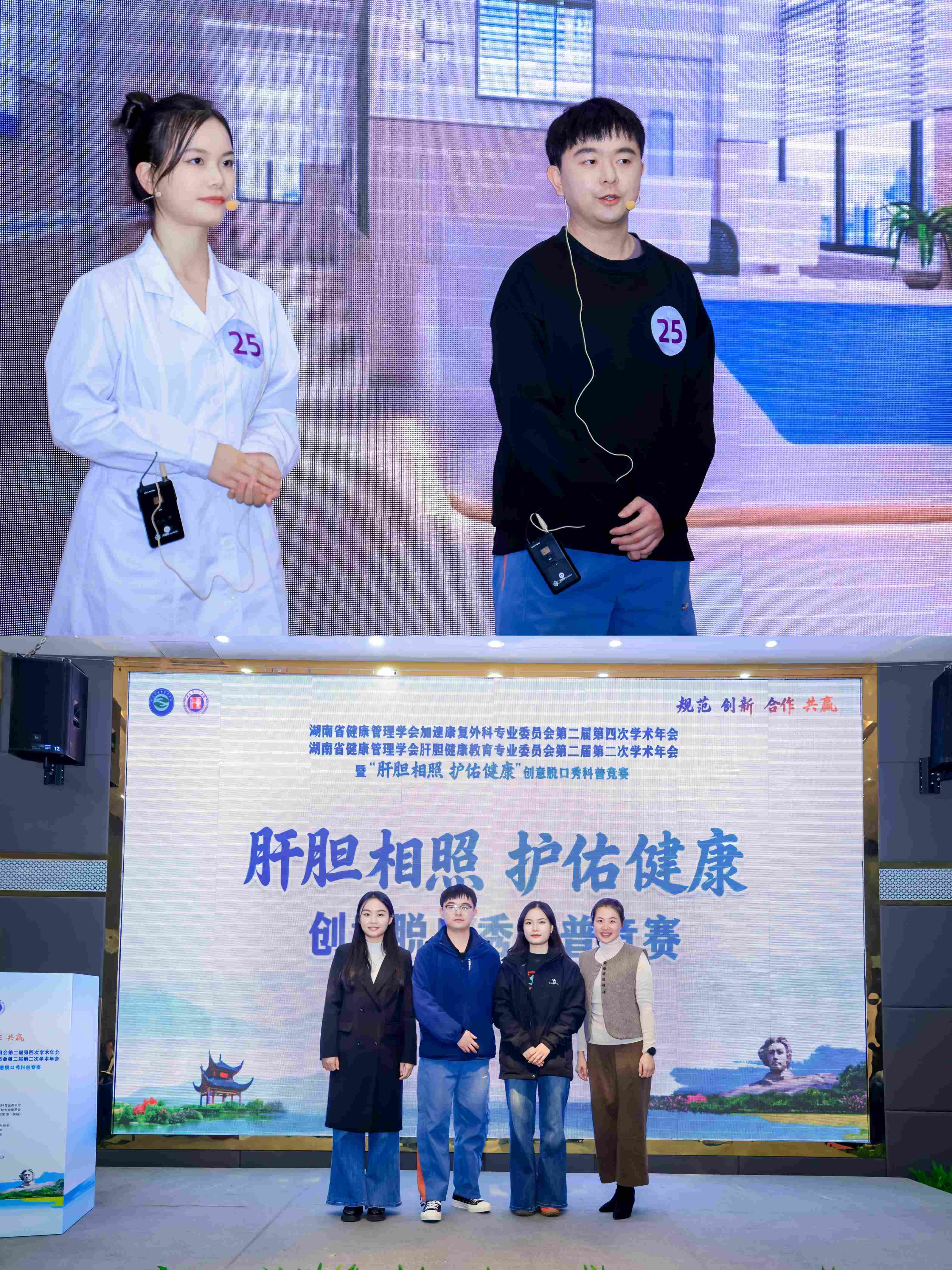 11月29日,由湖南省健康管理学会、湖南省人民医院联合主办的“湖南省健康管理学会肝胆健康教育专业委员会第二届第二次学术年会暨‘肝胆相照 护佑健康’创意脱口秀科普竞赛”在长沙圆满落幕。中南大学湘雅三医院肝胆胰外科二病区护士长徐培带领李培良、谭思思、熊文进、彭健凭借作品《“肝”货满满,“胆”战心惊》,在全省各级医院作品中脱颖而出,荣获竞赛二等奖。本次竞赛以贯彻落实《“健康中国2030”规划纲要》为宗旨,聚焦肝胆健康科普创新,推动了肝胆健康知识的大众化传播。在这场知识与创意碰撞的盛宴中,