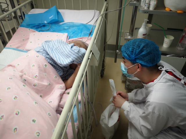 十岁的浩源是病房里的“老病人”了。罹患淋巴瘤的他由于重症感染不得不在隔离病房接受治疗。这样的经历让同学们感到心疼。刘同学主动蹲在浩源的床边,积极的和他聊天以缓解他有些低落的情绪。邓同学看到这歌情景忍不住转过头悄悄抹了眼泪:“很难想象一个十岁的孩子,需要多大的毅力才能坚持与病魔斗争啊!”