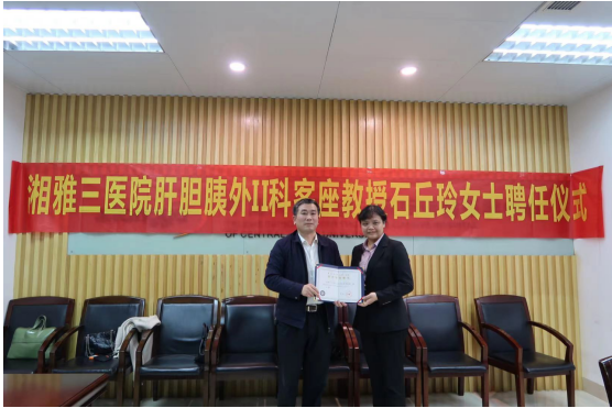 2021年3月24日,中南大学湘雅三医院肝胆胰外II科客座教授聘任仪式在远程会议中心举行,授聘临床流行病方法及医学统计学专家石丘玲女士为客座教授。仪式由人事科主任雷俊主持。