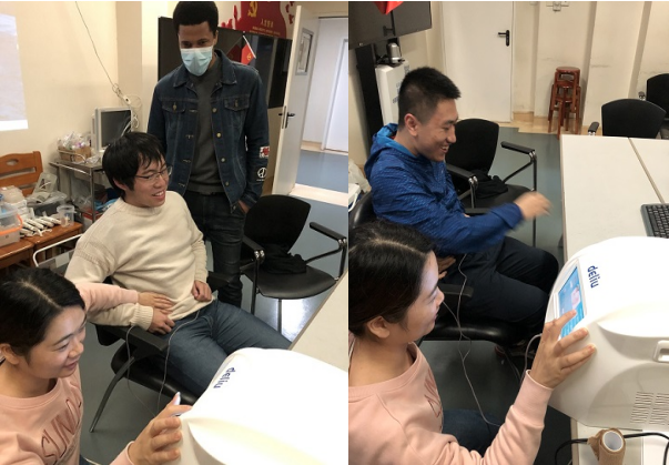 体验环节,把消毒后的左右两个电极片贴在体验者腹部后,通过逐步调节电流强度,让体验者感受不同的疼痛等级。刚开始一二级别时,大部分同学都面带微笑;三到五级还可以强颜欢笑;但到了七、八级有的同学已经开始大声尖叫,有的疼痛耐受不好的提出了放弃;九到十级,同学们表情已不受控制,心率和血压都明显增加,感觉到了剧痛。