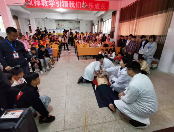 在实践的过程中有劳累也有惊喜,在技能普及活动进行到第三天的时候,湘雅三医院党委书记何庆南来到水口中学现场,他将临床经验倾囊相授,书本的知识、临床的经验、实践的体会相结合,让同学们感到受益匪浅。