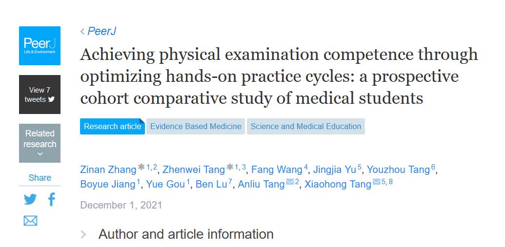 12月1日,中南大学湘雅医学教育研究团队、湘雅三医院临床技能培训中心唐晓鸿主任课题组在国际知名期刊《Peer J》(JCR2区)上发表医学教育研究文章《Achieving physical examination competence through optimizing hands-on practice cycles: a prospective cohort comparative study of medical students》。八年制学生张子南、汤镇维为文章共同第一作者,技能培训中心唐晓鸿、消化内科唐岸柳老师为文章的通讯作者。