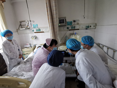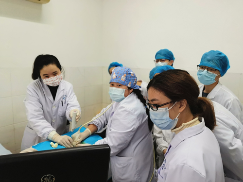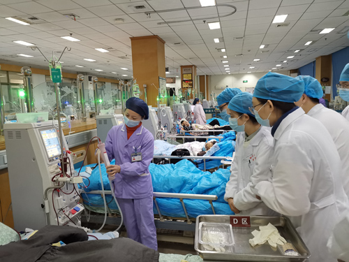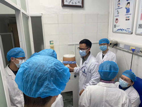 随后师生一行来到血液净化中心,参观了全机运行同时为数十名尿毒症患者进行肾脏替代治疗的血液净化室。在手术操作室,大家观摩了孙永超主治医师为肾小球疾病患者进行肾组织活检穿刺操作。血液净化中心热心的带教老师罗超群护士也利用工作间隙时间主动为同学们详细介绍了不同血液净化方式的工作原理和基本构成,并演示了设备的操作流程。最后孙永超老师为同学们带来一个图文并茂的血管通路知识讲解。