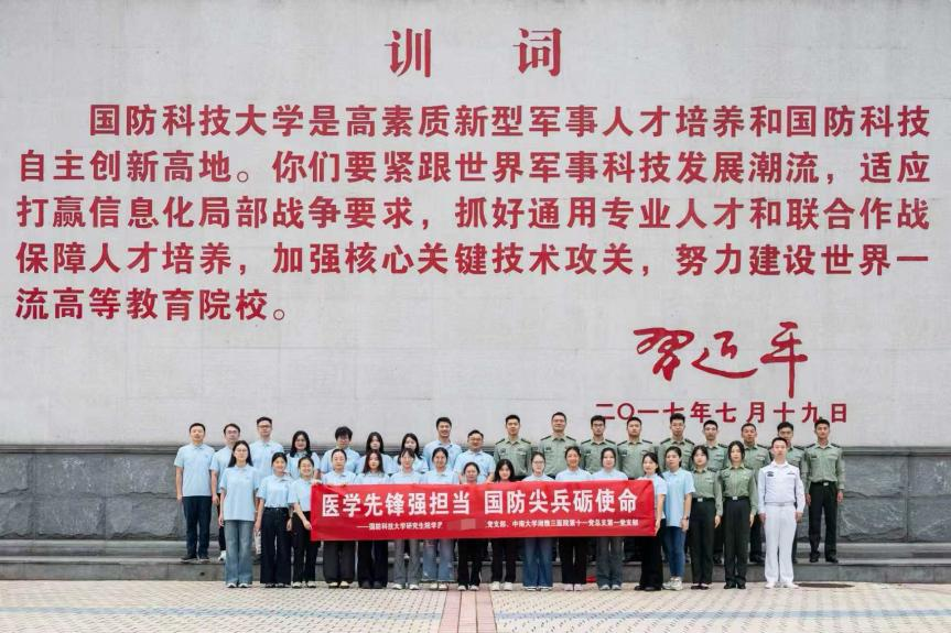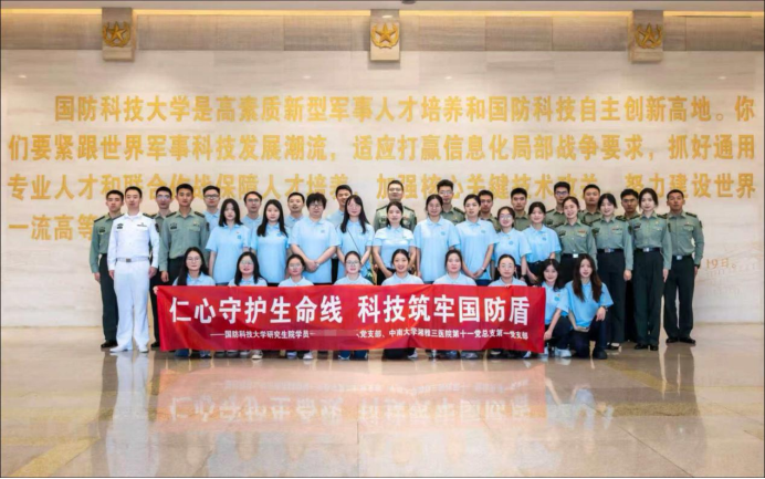 为深入贯彻落实新时代党的建设总要求,推动研究生党建与思想政治教育工作高质量发展,10月12日,中南大学湘雅三医院第十一党总支第一党支部与国防科大研究生院某学员队党支部开展交流互学活动。此次活动以“医学先锋强担当,国防尖兵砺使命”为主题,通过教育共享、资源共用、文化共建等多种形式,搭建起军地院校互动互学桥梁。党委委员、副院长曹科带领研究生党建班导师、研究生部老师以及支部成员30余人赴国防科技大学参加活动。