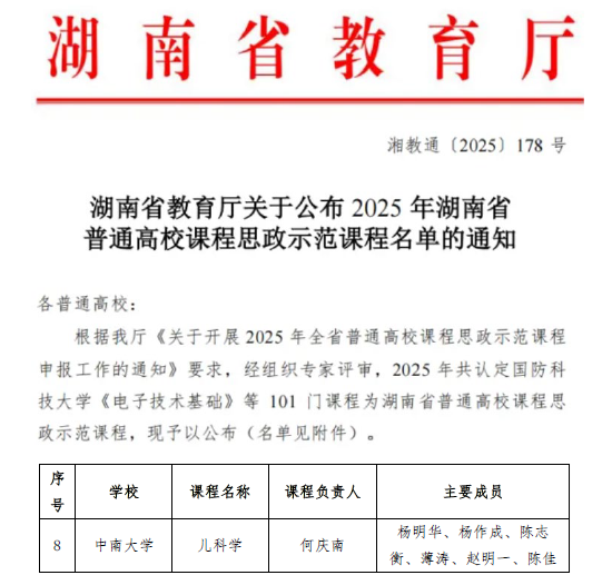 9月25日,湖南省教育厅公布2025年湖南省课程思政示范课程名单,由中南大学湘雅三医院(第三临床学院)何庆南教授团队牵头的儿科学成功入选,这是医院在深化医学教育改革、推进课程思政体系建设中取得的重要成果,充分体现了湘雅三医院(第三临床学院)在落实立德树人根本任务、推动医学教育高质量发展方面的成效。