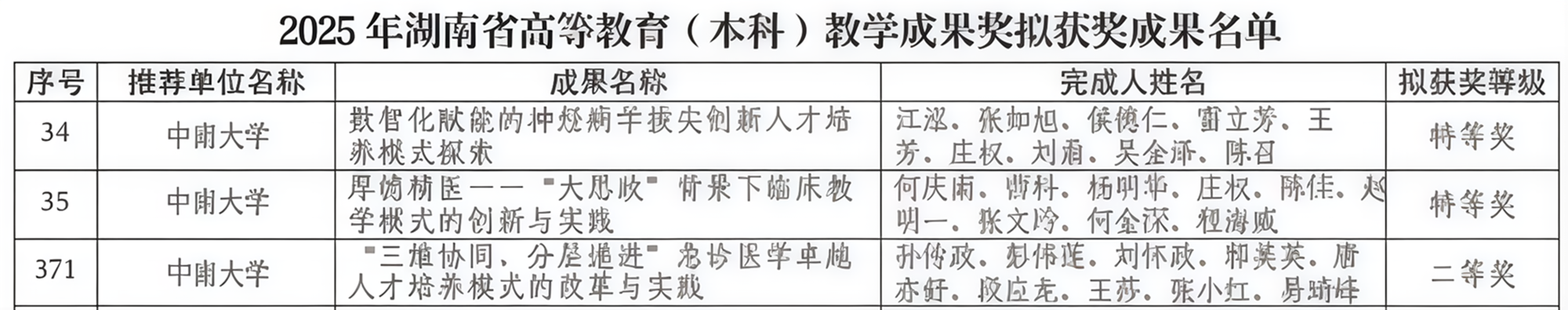 近年来,在医院党政领导下,在主管教学的副院长曹科及以教务部为主的各教学管理部门和各教研室的共同努力下,医院坚持把立德树人贯穿医学人才培养全过程,持续强化教学团队建设与成果培育机制,围绕临床教学改革、课程建设与拔尖创新人才培养等重点方向,推进教学理念更新、教学模式创新和质量保障体系完善。此次三项成果入选省级教学成果奖,既展现了百年湘雅医学传承的全新活力,又成为新湘雅医学教育“四名工程”高质量发展的里程碑。
