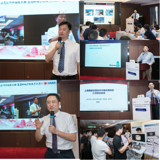 学术交流环节来自武汉协和医院李文成教授以500余例裸镜实战经验,与参会专家分享一期软镜手术中的顾虑及解决方案。广西医科大学附属第二医院汪小明教授从炎症复合指标对上尿路结石术后发生全身炎症反应综合症角度,用临床实验数据分析结果,与会分享了如何更好地通过相关指标预测术后可能发生的问题。广西中医药大学附属瑞康医院梁泰生教授,通过图片及视频将个人手术中手术体位的改变技巧与无管化术后缝合等一些相关经验从化繁为简角度助力临床工作,进行详细的分享。在下午场,上海仁济医院夏磊教授重磅出席,在各位同道都非常关注的上尿路结石微创手术相关感染方向展开分享,获得参会老师们的高度认可。