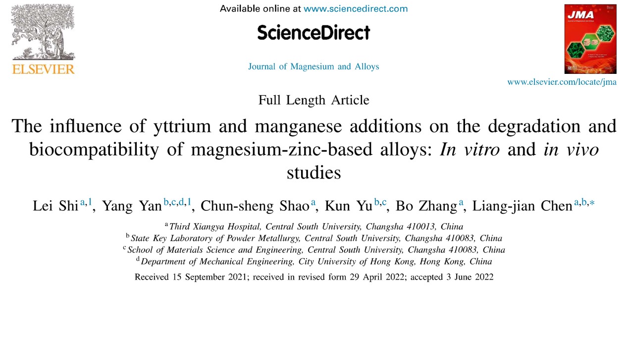 近日,中南大学湘雅三医院口腔科陈良建教授团队在镁合金材料领域顶级期刊《Journal of Magnesium and Alloys》(IF 11.873)以“原创论著”形式在线发表镁合金植入材料原创成果“The influence of yttrium and manganese additions on the degradation and biocompatibility of magnesium-zinc-based alloys: In vitro and in vivo studies”。中南大学湘雅三医院口腔科硕士研究生石蕾及香港城市大学博士研究生颜阳为论文共同第一作者,陈良建教授为论文通讯作者,中南大学湘雅三医院为第一单位和唯一通讯单位。本研究得到了中南大学材料与工程学院余琨教授团队大力支持,该研究受到国家自然科学基金及湖南省重点研发项目等资助。