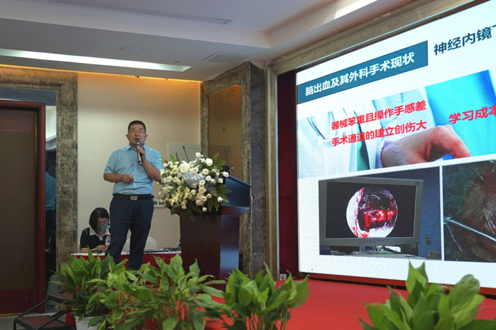 在学术交流环节,来自省内外的专家围绕高血压脑出血内镜治疗手术适应症、操作细节等进行理论分享,站在手术安全、如何避免手术风险、降低术后并发症的角度,结合内镜治疗的优势,使用技巧展开分享,一堂堂内容精彩的授课引发了全场一阵阵掌声。湘雅三医院神经外科卢韶华副教授“内镜治疗自发性脑出血策略讨论”、颜辉医师“内镜下脑内血肿清除相关解剖理论和手术经验分享”、龙俊医师“自发性脑出血手术常用入路及优缺点”的经验分享也充分展示了医院在该领域的技术实力。