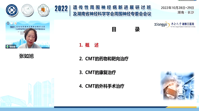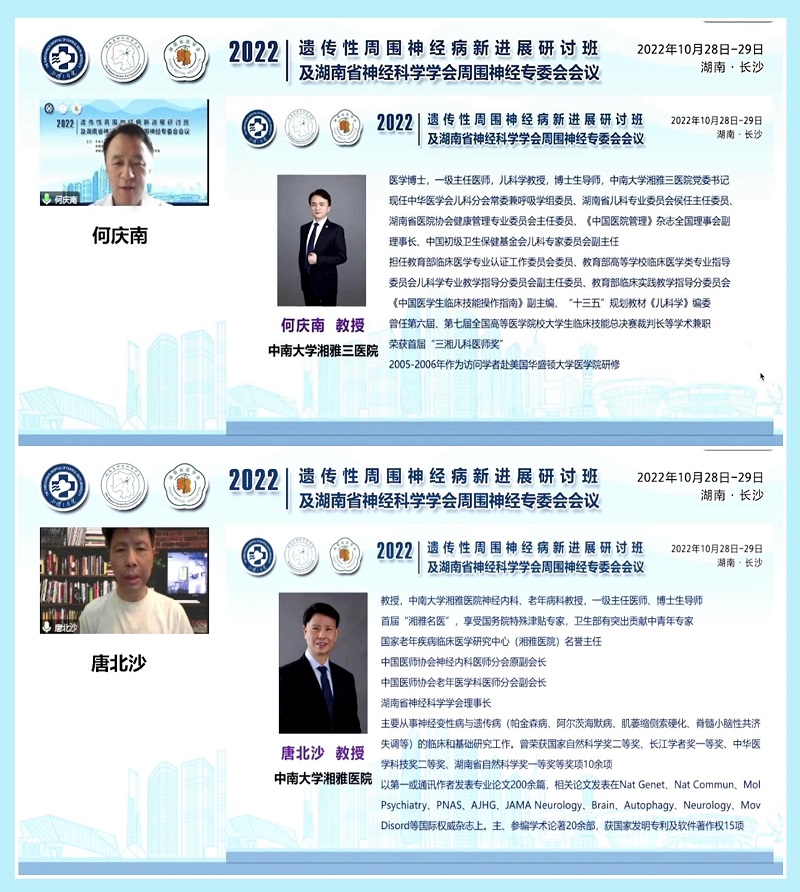 10月28、29日,由中南大学湘雅三医院神经内科和湖南省医学会神经内科学专业委员会主办的国家继续医学教育项目遗传性周围神经病新进展研讨班(项目编号:2022-03-07-257)、第三届湖南省神经科学学会周围神经病专委会在线上召开。中南大学湘雅三医院党委书记何庆南教授、湖南省神经科学学会理事长唐北沙教授分别致开幕辞,湘雅三医院神经内科主任张如旭教授任本次会议大会主席。