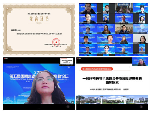 12月11日,中南大学湘雅三医院耳鼻咽喉头颈外科嗓音团队肖益芳嗓音治疗师作为代表受邀参加了第五届国际言语语言病理学高峰论坛——嗓音障碍专题论坛并做大会发言。发言就环杓关节半脱位合并嗓音障碍患者的治疗进行阐述:在手术复位未成功后,采用联合嗓音治疗策略和团队自创的改良版喉部操作手法结合发音训练个性化治疗。所取得的疗效受到了美国南加州大学言语语言病理学专家欧阳来祥和与会专家的高度重视与认可。