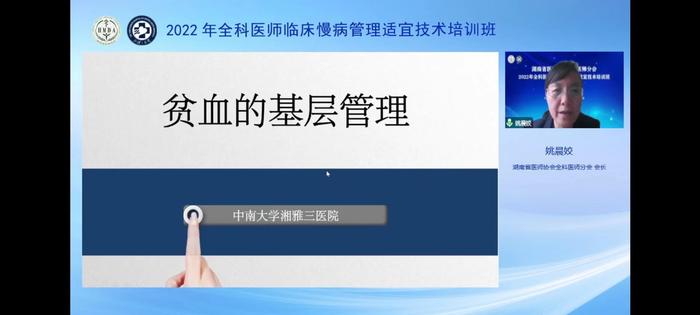 湖南省医师协会全科医师分会会长、中南大学湘雅三医院毕教办主任姚晨姣教授在开幕仪式上致辞,她指出我们要贯彻落实习总书记在健康中国2030的规划纲要,以普及健康生活、优化健康服务、建设健康环境、发展健康产业为重点,全方位、全周期保障人民健康,大幅度提高健康水平,显著提升健康公平。健康是人民幸福生活的重要指标,国家把人民健康放在第一位,全科医生作为健康守门人,需要做到“小病善治,大病善识,重病善转,慢病善管,未病善防”。她希望通过本次会议,进一步提升我省全科医生慢病管理水平,改善基层医疗卫生服务能力,加强基层医疗人才队伍的建设,促进我省全科行业医务人员学术交流。同时,她进行了“贫血基层管理”的学术讲座,重点说明了社区医师在宣传防病治病知识、监测高发人群、发现早期患者、管理患者、指导治疗过程中发挥了至关重要的作用。