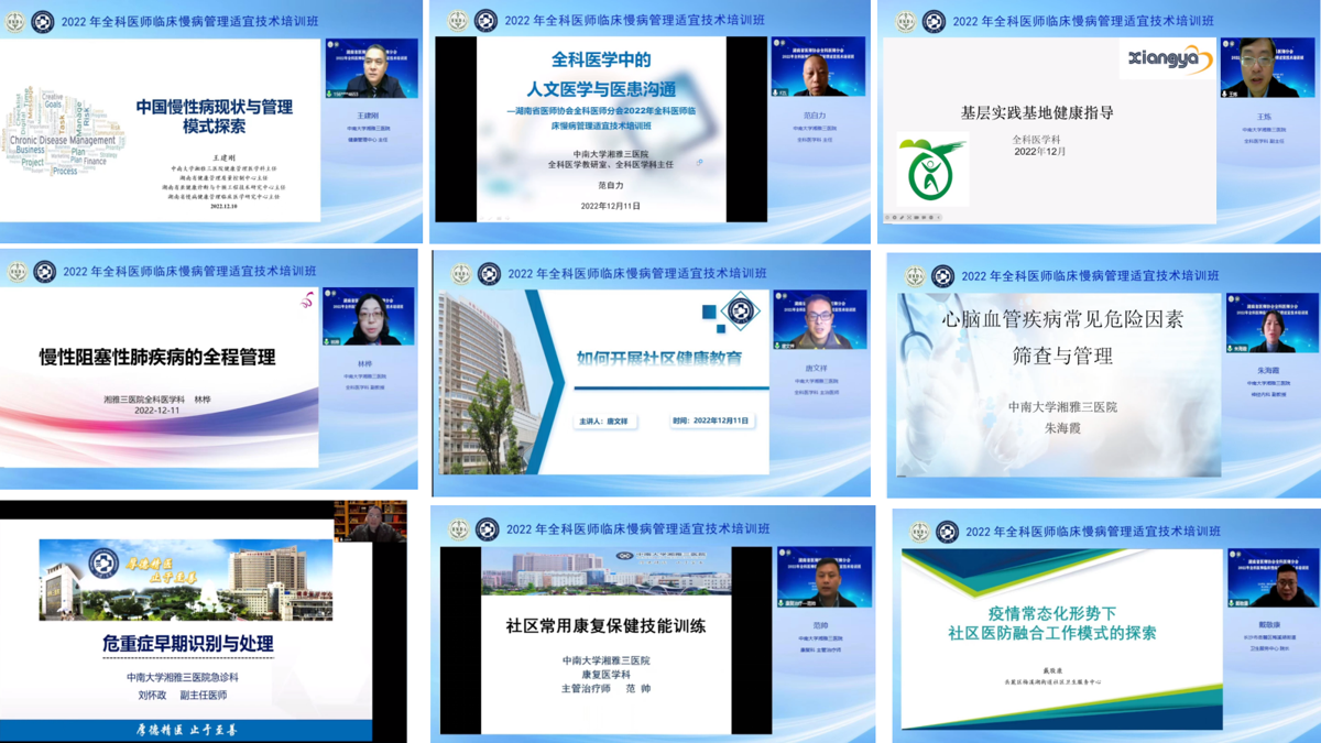 12月10、11日,由湖南省医师协会全科医师分会主办、中南大学湘雅三医院承办的2022年全科医师临床慢病管理适宜技术培训班顺利开班。培训围绕全科医生慢病管理技术的最新进展与前沿动态,借鉴各专家在慢病管理方面的工作及实践经验,进行了精彩的专题授课。大会邀请了国内知名全科专家,采取线上方式进行,吸引了全省各地全科及相关学科医务人员参会,在线学习人数高达1000余人。