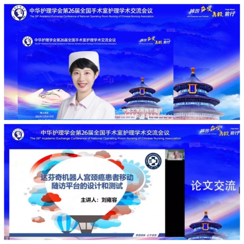 2022年12月24日至26日,中华护理学会第26届全国手术室护理学会在线上举行。中南大学湘雅三医院手术中心刘雍容作为湖南省唯一入选论文代表,应邀以《达芬奇机器人宫颈癌患者移动随访平台的设计及测试》论文在大会进行专题演讲。