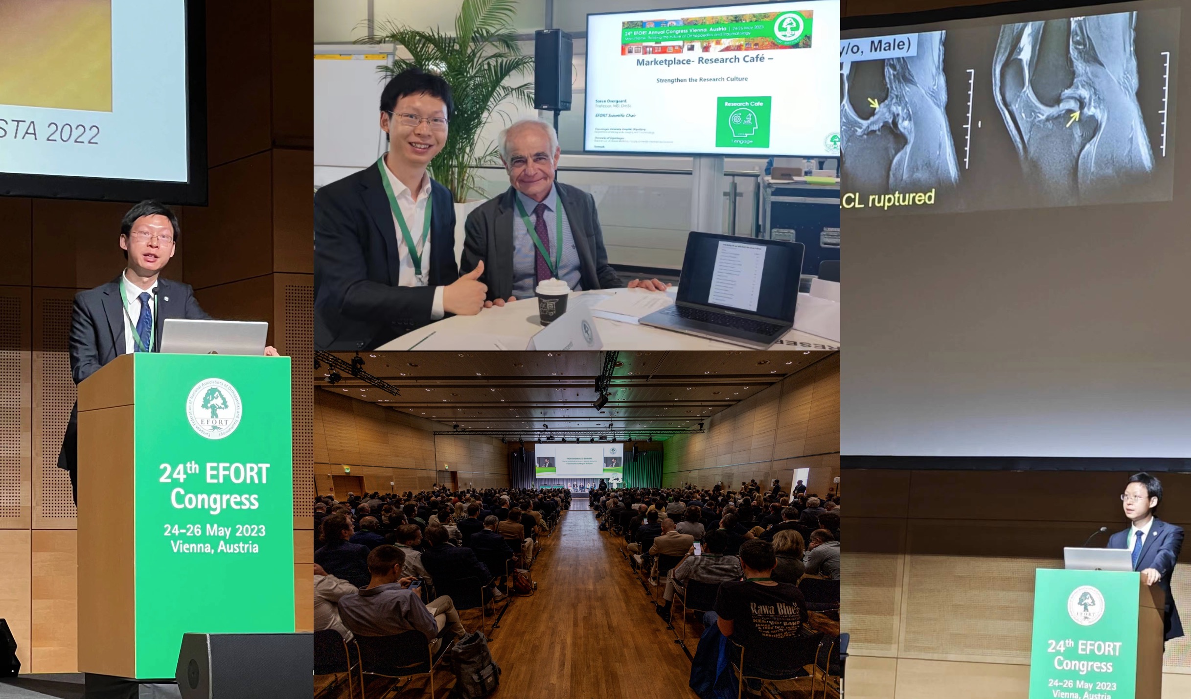 5月24日-26日,第24届欧洲骨科年会(EFORT)在奥利地首都维也纳召开。作为国内骨科-运动医学领域的唯一代表,中南大学湘雅三医院骨科何金深副教授受邀出席,在会上发表了题为“术前超声精准预测自体腓骨长肌腱移植物直径”的报告,获得了国际同行的赞扬。