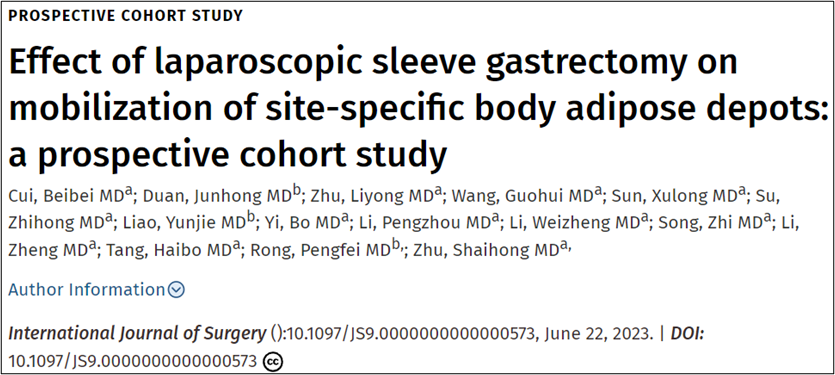 6月22日,中南大学湘雅三医院减重代谢外科朱晒红教授、朱利勇副教授团队联合医院放射科容鹏飞教授课题组于国际权威学术期刊International Journal of Surgery(IF=15.3)在线发表高水平论文“Effect of laparoscopic sleeve gastrectomy on mobilization of site-specific body adipose depots: a prospective cohort study(腹腔镜袖状胃切除术对特定部位脂肪库动员的影响:一项前瞻性队列研究)”,证实减重代谢手术对不同部位脂肪库的差异化动员效应,为非酒精性脂肪肝及内脏脂肪异位治疗提供了重要思路。中南大学湘雅三医院为第一及通讯作者单位,朱晒红和容鹏飞教授为共同通讯作者,朱利勇副教授、崔贝贝博士研究生和放射科段俊宏博士研究生为该论文共同第一作者,该研究受到湘雅三医院汇智育才项目的资助和支持。