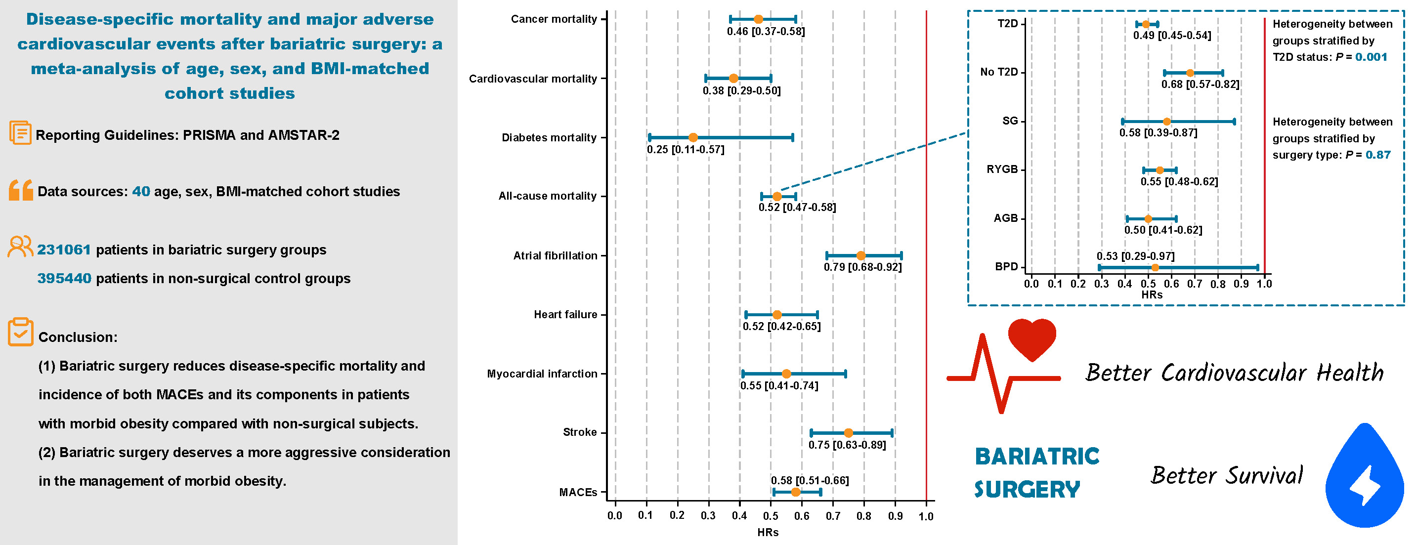 此外,朱晒红、朱利勇团队长期致力于减重代谢外科循证医学证据积累和总结,近期在International Journal of Surgery(IF=15.3)发表了基于匹配队列研究的高质量研究《Disease-specific mortality and major adverse cardiovascular events after bariatric surgery: a meta-analysis of age, sex, and BMI-matched cohort studies》。该研究表明,与非手术治疗相比,减重代谢手术显著降低疾病特异性(癌症、心血管、糖尿病)死亡率和主要不良心血管事件(MACEs)及其组分(心房颤动、心力衰竭、心肌梗死、中风、全因死亡)发生率。亚组分析表明,2型糖尿病患者接受减重代谢手术后全因死亡率下降更显著,而不同减重代谢手术方式对全因死亡率的降低无显著差异。