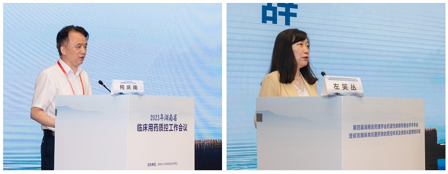 国家卫健委医疗质量与评价处处长马旭东、湖南省卫健委副主任祝益民在开幕式致辞。湖南省卫健委医政医管处调研员周一鸣、中南大学湘雅三医院党委书记何庆南、安徽省立医院南区副院长姜玲、中南大学湘雅三医院副院长左笑丛、中国药理学会药源性疾病专委会副主委闫素英、湖南省药理学会理事长刘昭前、湖南省药学会理事长李焕德、郴州市卫健委医政医管科科长李满英、湖南省临床用药质量控制中心主任/药源性疾病专委会主任委员刘世坤等出席了开幕式。何庆南、左笑丛代表医院分别致辞。