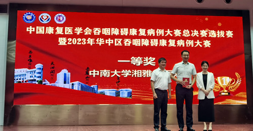8月24-26日,湖南省康复医学会吞咽障碍康复专业委员会成立大会暨华中地区吞咽障碍康复病例大赛在湖南长沙举行。由中南大学湘雅三医院耳鼻喉科医师郜儒博士、吴建红主管护师以及康复科谢文亮治疗师组成的康复团队从来自湖南、湖北、河南的36支队伍中脱颖而出,荣获一等奖。
