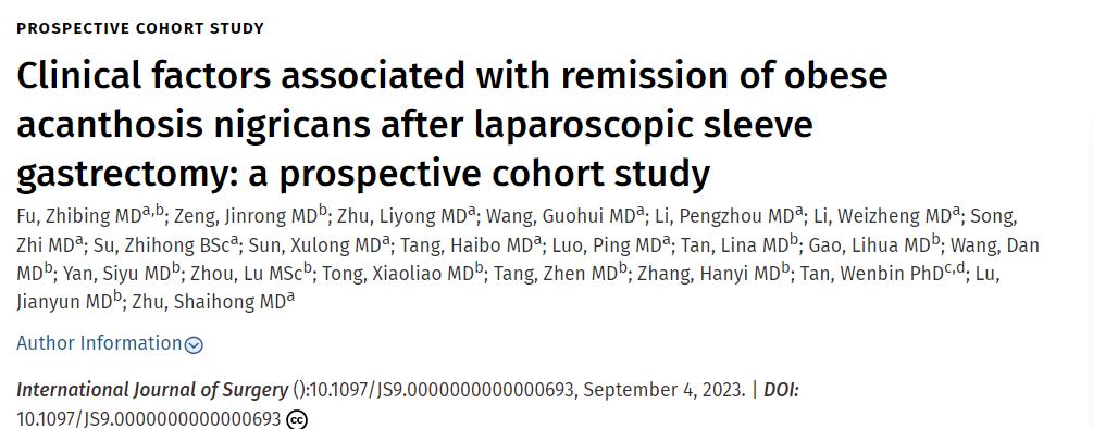 近日,中南大学湘雅三医院胃肠外科Ⅱ科朱晒红、朱利勇教授团队联合皮肤科鲁建云课题组于国际权威学术期刊《International journal of surgery》(《国际外科学杂志》,IF=15.3)在线发表高水平论文"Clinical factors associated with remission of obese acanthosis nigricans after laparoscopic sleeve gastrectomy: a prospective cohort study”(《腹腔镜袖状胃切除术后肥胖相关型黑棘皮病缓解相关临床因素探索:一项前瞻性队列研究》)”,朱晒红和鲁建云教授为该研究的共同通讯作者,朱利勇教授、曾金容副研究员、付志兵博士研究生为该论文共同第一作者。中南大学湘雅三医院为该项研究成果的第一完成单位及通讯作者单位。