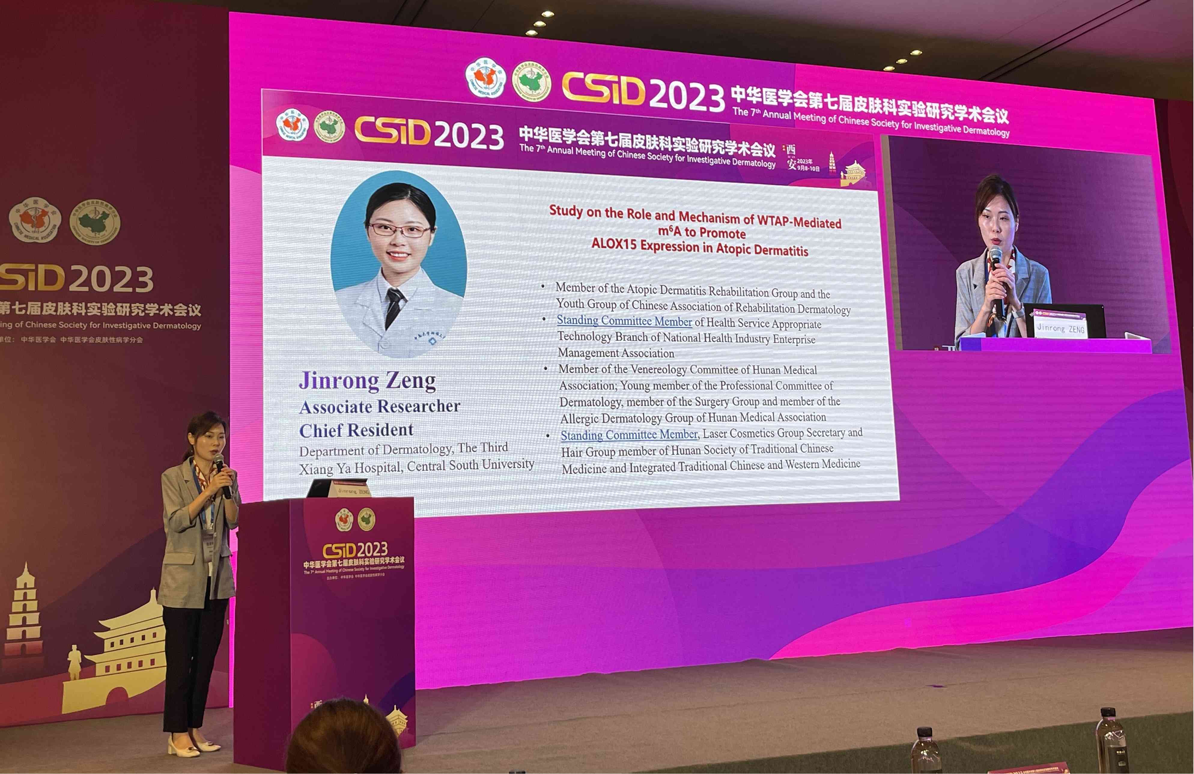曾金容副研究员代表鲁建云教授就以代谢特征驱动的皮肤色素性疾病如黑棘皮病进行了题为《Clinical factors associated with remission of obese acanthosis nigricans after bariatric surgery》的主题报告,报告中提到在前期的前瞻性队列研究中,通过患者临床特点、生化指标和皮损特点等分别揭示了肥胖相关型黑棘皮病患者术前术后的代谢及病理改变,并提出胰岛素水平及睾酮水平等激素代谢失代偿可能是肥胖相关型黑棘皮病皮损形成的重要驱动因素,这一全新观点的提出为肥胖相关型黑棘皮病的机制研究提供了重要临床线索。谭丽娜副主任及曾金容副研究员代表特应性皮炎研究小组分别做了题为《Potential role of N6-Methyladenosine of RNAs in the Pathophysiology of Atopic Dermatitis》和《Study on the Role and Mechanism of WTAP-Mediated m6A to Promote ALOX15 Expression in Atopic Dermatitis》的学术报告,汇报了团队近期关于特应性皮炎的主要研究成果,两场主题报告分别汇报了特应性皮炎皮损中表观遗传修饰m6A诱导皮肤屏障功能障碍、脂质代谢异常的深入机制研究,报告得到了会场多位专家的一致好评。