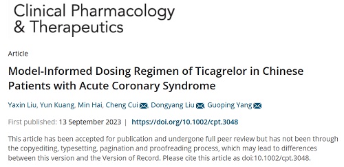 近期,中南大学湘雅三医院临床试验研究中心阳国平教授团队在临床药理学权威期刊《Clinical Pharmacology&Therapeutics》(《临床药理学与治疗学》IF:6.7中国科学院一区)在线发表了论文“Model-Informed Dosing Regimen of Ticagrelor in Chinese Patients with Acute Coronary Syndrome(《模型引导的替格瑞洛在中国急性冠脉综合征患者中的给药方案探索》)”。阳国平教授、北京大学第三医院刘东阳教授及崔诚副研究员为论文共同通讯作者,刘亚昕博士、况赟博士及北京大学第三医院硕士海旻为论文共同第一作者。中南大学湘雅三医院为第一及通讯作者单位。