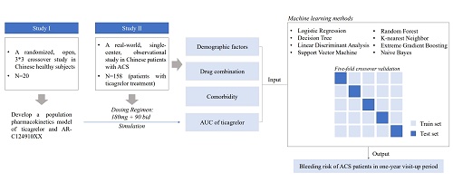 抗血小板个体化精准治疗一直是临床的重要关注点。阳国平教授课题组前期一项前瞻性真实世界研究(NCT02888652)结果表明,ACS患者接受替格瑞洛治疗后,出血风险较接受氯吡格雷者显著增加,提示目前临床上使用替格瑞洛的剂量可能偏高。因此,阳国平教授团队又开展了替格瑞洛的PK/PD临床研究。本项研究是基于临床研究数据,结合群体药动学模型和机器学习方法探索了中国ACS患者中的“剂量-暴露-出血风险”关系,以构建替格瑞洛在中国ACS患者中的个体化用药模型,在保证抗血小板疗效的基础上,降低出血风险。