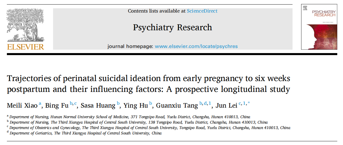 近日,中南大学湘雅三医院雷俊教授团队在高水平学术期刊《精神病学研究》(Psychiatry Research,IF=11.3)在线发表高水平论文“围产期女性孕早期至产后自杀意念的发展轨迹及影响因素研究:一项前瞻性队列研究”(Trajectories of perinatal suicidal ideation from early pregnancy to six weeks postpartum and their influencing factors: A prospective longitudinal study)。雷俊教授为通讯作者,博士研究生肖美丽为第一作者,中南大学湘雅三医院为通讯作者单位。