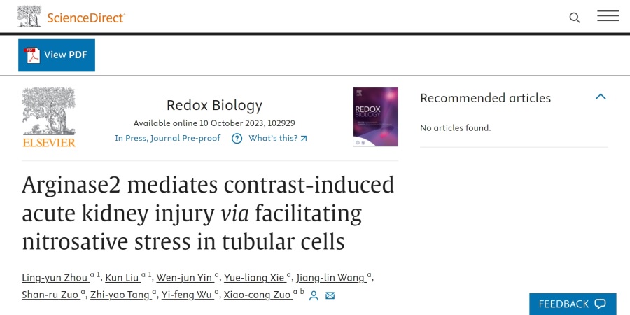 2023年10月12日,中南大学湘雅三医院左笑丛、周凌云团队在氧化还原领域权威期刊《Redox Biology》(中国科学院1区Top期刊,IF=11.4)以Research Article形式发表题为“精氨酸酶2通过介导肾小管上皮细胞硝化应激引起碘对比剂肾病”(Arginase2 mediates contrast-induced acute kidney injury via facilitating nitrosative stress in tubular cells)的原创研究论文。湘雅三医院左笑丛教授为独立通讯作者,药学部周凌云副主任药师、博士研究生刘昆为共同第一作者,中南大学湘雅三医院为第一单位和通讯单位。
