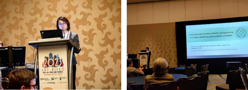 湘雅三医院放射科马小倩副教授作为团队代表在“InflammatoryResponses,Innate&AdaptiveImmunity”分会场向与会学者作“4-Octyl itaconate reverses metabolic reprogramming of T cells in aGVHD by partial inhibition of GAPDH”主题分享。该研究系统揭示了4-OI可通过逆转代谢重编程抑制活化T细胞的增殖和功能,证明其可能是一种潜在的治疗GVHD和自身免疫性疾病的药物。分享后,分会场主持人贝斯以色列女执事医疗中心MariaKoulmanda教授和杜克大学Joe Ladowski教授对其开创性的研究成果提出高度关注并表示赞赏。