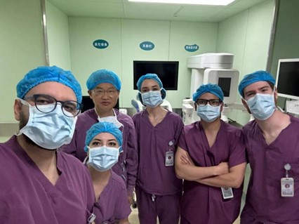 10月27日,南里奥格兰德天主大学附属医院Cláudio Mottin、智利大学BRAVO LOPEZ等来自巴西、智利、俄罗斯、阿根廷、沙特阿拉伯、伊朗等国家的10位国际知名减重代谢外科专家来医院进行减重代谢手术观摩,精彩的手术演示获得国际专家的高度赞赏。医院朱晒红教授首先向外籍专家介绍腔内镜联合减重手术的优势,朱利勇副教授详细讲解了袖状胃切除手术标准化的操作细节要点,并针对胃底的显露和处理经验同外籍专家进行深入交流。随后在朱晒红教授的带领下,Mottin等参观了由医院自主研发的国产手术机器人。朱晒红介绍团队自2008年起开启的国产手术机器人的自主研发之路,未来将进继续推进手术机器人的优化和升级。国际专家对朱晒红团队医工结合研究工作大为惊叹,并表示当前中国医疗器械在国外受到普遍的欢迎,期待有机会在其国内能够早日用上湘雅三医院团队开发的手术机器人。
