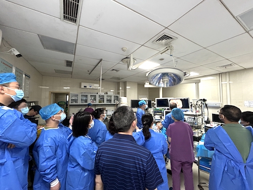 湘雅三医院副院长孙传政,肝胆胰外科I科刘浔阳教授,湖南省医学会门静脉高压症专业学组组长、湘雅三医院肝胆胰外科I科卢焕元副教授分别为会议致辞。湘雅三医院肝胆胰外科I科黄飞舟教授做主旨演讲,详细介绍了医院开展的两百余例EUS-PPG的临床与实验研究结果。邓刚副教授团队进行了EUS-PPG手术演示,引起了与会专家的共同关注与热议。