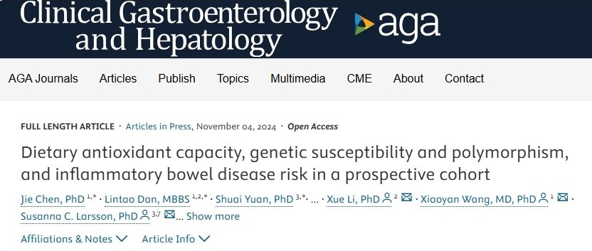 2024年11月,中南大学湘雅三医院消化内科王晓艳教授/陈杰特聘副教授团队在消化病学中国科学院一区Top期刊《临床胃肠病学和肝病学》(Clinical Gastroenterology and Hepatology,IF 11.6) 发表原创性论著《饮食总抗氧化力对IBD发病风险的影响:结合遗传易感性和基因多态性的前瞻性队列研究(Dietary antioxidant capacity, genetic susceptibility and polymorphism, and inflammatory bowel disease risk in a prospective cohort )》,首次揭示了饮食总抗氧化力水平对炎症性肠病 (IBD) 发病的保护作用,并通过饮食-基因交互阐明了抗氧化还原酶基因多态性对于实现饮食精准防治IBD的重要指导意义。中南大学湘雅三医院消化内科医师、特聘副教授陈杰为论文第一作者,消化内科王晓艳教授为论文共同通讯作者。中南大学湘雅三医院为论文第一单位。