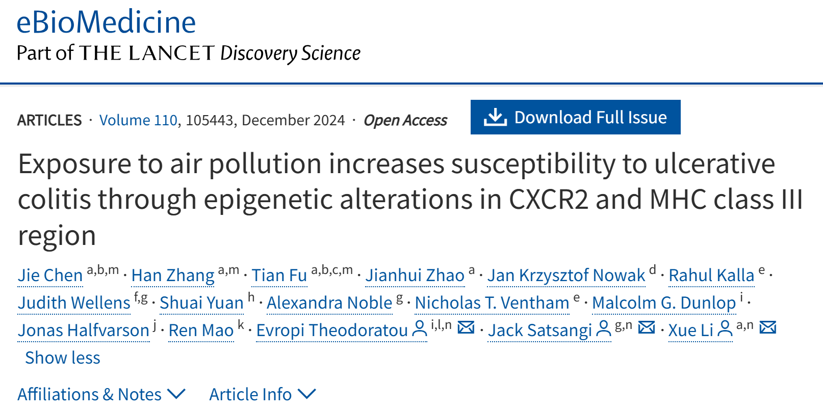 近期,中南大学湘雅三医院消化内科陈杰特聘副教授团队在柳叶刀子刊、研究与试验Top期刊eBioMedicine (IF 9.7) 发表原创性研究论文《空气污染暴露通过CXCR2和MHC III区域的表观遗传改变增加溃疡性结肠炎的发病风险 (Exposure to air pollution increases susceptibility to ulcerative colitis through epigenetic alterations in CXCR2 and MHC class III region)》,首次揭示了空气污染通过改变表观遗传修饰影响溃疡性结肠炎 (UC) 发病机制,并通过环境与表观遗传修饰的交互,阐明了调控表观遗传位点对于防治空气污染对肠道损伤及UC发病的潜在防治靶点,对溃疡性结肠炎的精准预防具有重要指导意义。消化内科医师/特聘副教授陈杰为论文第一作者,消化内科双聘PI浙江大学李雪研究员为论文通讯作者。