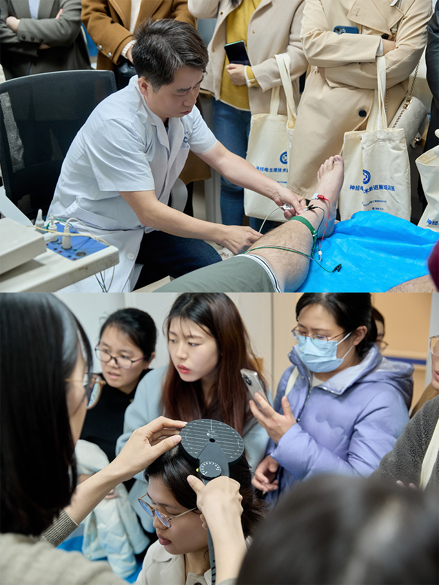 随后,张如旭教授详细讲解了周围神经病的诊断思路,聚焦定向与定位诊断、受累纤维成分分析及病因诊断等关键内容;黄献教授系统介绍了脑电图的判读方法;黄顺祥和赵华栋主管技师展示了神经传导速度、神经肌电图、运动诱发电位、热痛诱发电位等技术的规范化操作,并结合典型病例进行了深入讲解。