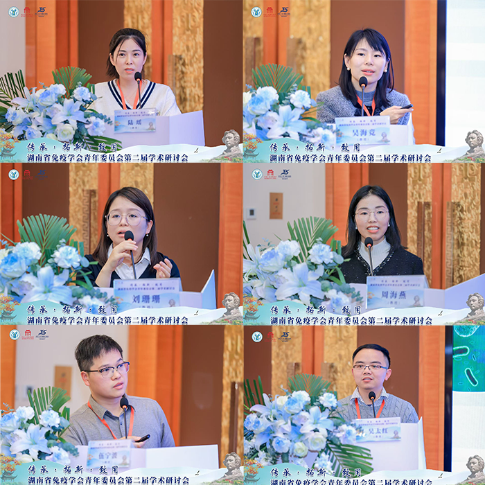 下午的学术报告环节,湘雅三医院陆瑶教授就“内皮免疫与搭桥血管重构”、湘雅二医院吴海竞教授就“健康生活方式通过代谢产物对免疫衰老的调控作用及对自身炎症性疾病的治疗作用”、刘珊珊教授就“巨噬细胞与肺纤维化”、湘雅医院周海燕教授就“骨髓免疫与能量代谢”、湖南大学伍宁波教授就“肠道炎症和纤维化疾病中新型间质细胞亚群的功能鉴定及机制研究”、吴太红教授就“病原微生物感染重塑动物行为的机制研究”分别进行精彩报告。