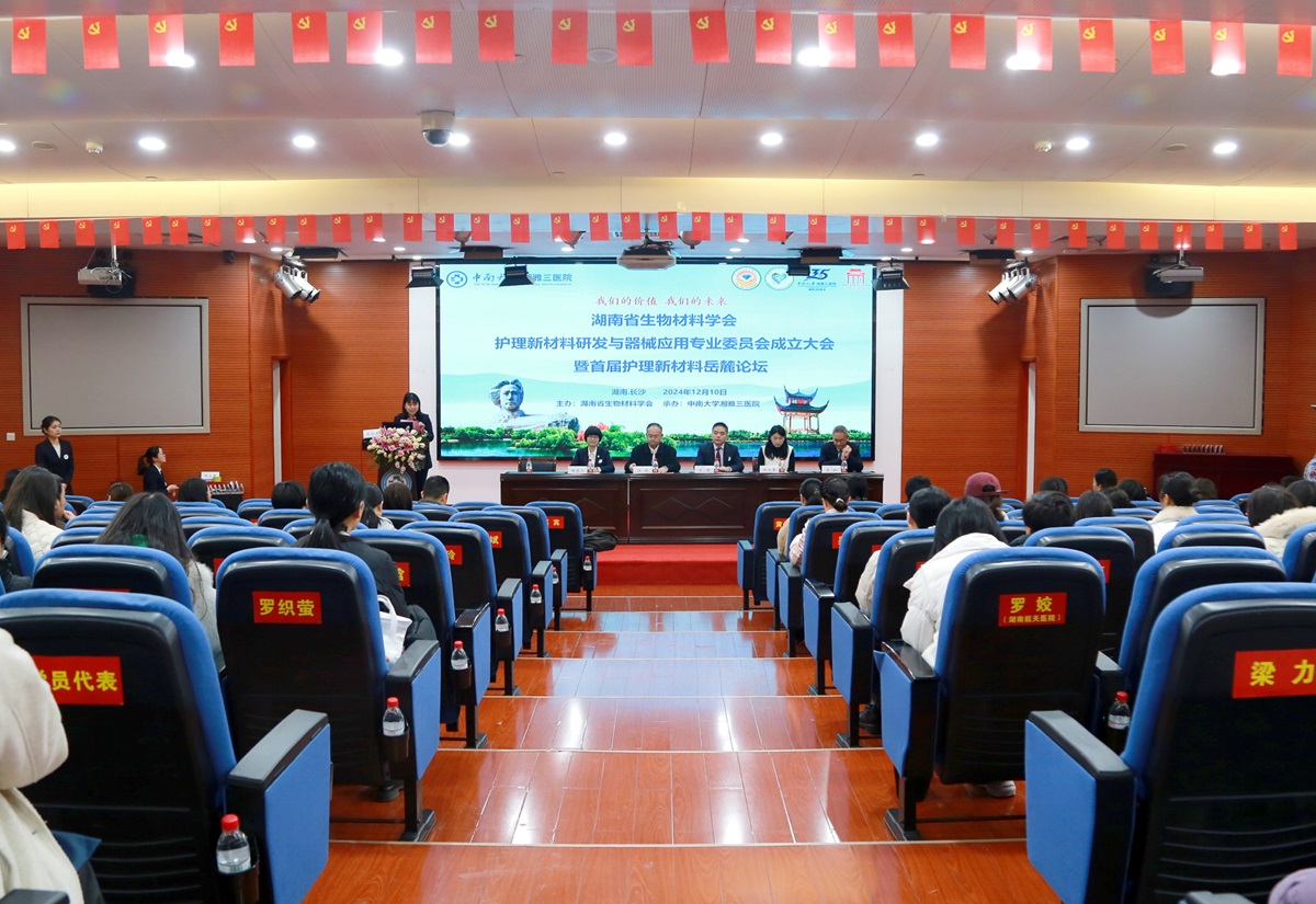 12月10日,湖南省生物材料学会护理新材料研发与器械应用专业委员会成立大会暨首届护理新材料岳麓论坛在中南大学湘雅三医院外科楼二楼学术报告厅召开。本次大会以“我们的价值&我们的未来Our Value & Our Future”为主题,旨在推动护理新材料领域的学术交流与成果转化。湖南省生物材料学会理事长肖涛、秘书长张义鲁,中南大学湘雅三医院院长江泓,医院护理部主任严谨、骨科主任吴松等相关专家出席,护理部科护士长张秋香主持。