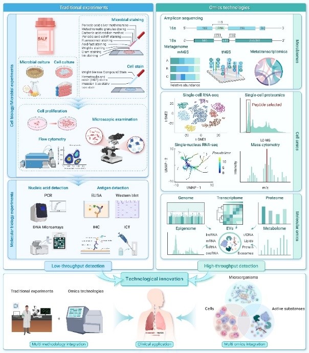 传统的BALF检测主要依赖于细胞学、微生物学和分子生物学实验,但这些方法存在灵敏度低、定量不精确等局限性。随着多组学技术的发展,科学家们现在能够通过高通量手段全面分析BALF中的细胞、微生物及活性物质,揭示它们之间复杂的相互作用,为精准医学提供了新的视角(图1)。因此,该文系统探讨了BALF的临床应用价值,并阐述了新兴技术如何推动其在医学领域的进一步发展,为肺部疾病的精准诊断与个性化治疗提供了强有力的支持。