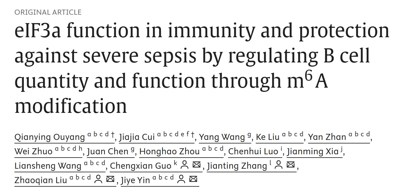 2025年2月,中南大学湘雅三医院临床试验研究中心主任郭成贤联合湘雅医院临床药理研究所尹继业教授团队、刘昭前教授团队、美国托莱多大学医学和生命科学学院张建亭教授团队,在《Acta Pharmaceutica Sinica B》(中国科学院1区,IF=14.7)发表题为“eIF3a在免疫反应中的功能及通过m6A修饰调节B细胞数量和功能以保护机体免受重症脓毒症的影响(eIF3a function in immunity and protection against severe sepsis by regulating B cell quantity and function through m6A modification)”的研究论文。湘雅医院19级博士毕业生欧阳倩颖与湘雅医院博后崔佳佳为论文并列第一作者。