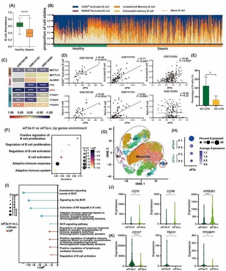 该研究通过构建eIF3a条件性敲除小鼠模型,发现eIF3a缺失的小鼠在脓毒症模型中表现出更为严重的临床症状,包括更高的死亡率、更严重的炎症损伤以及B细胞功能障碍。同时,通过对比脓毒症患者与健康人之间B细胞功能和数量的差异以及分析eIF3a表达水平与B细胞功能的关系,发现脓毒症患者的eIF3a表达水平显著降低,且与B细胞功能受损紧密相关。恢复eIF3a表达可显著改善脓毒症症状,降低死亡率(图2)。