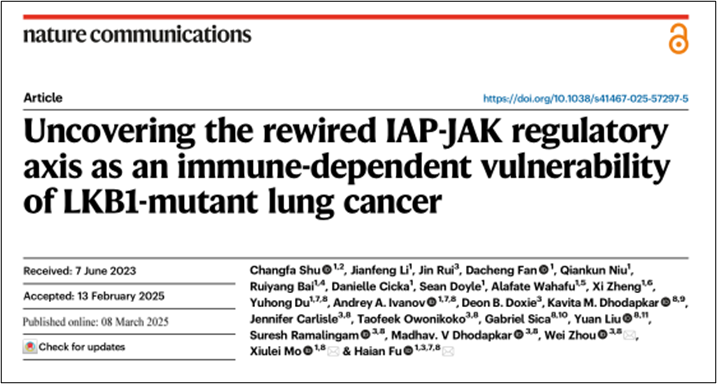近日,中南大学湘雅三医院妇科徐大宝教授科研团队成员舒常发博士在国际权威学术期刊《Nature Communications》(NI指数期刊,IF=14.70)上以论著形式发表了题为《Uncovering the rewired IAP-JAK regulatory axis as an immune-dependent vulnerability of LKB1-mutant lung cancer》的原创性研究成果。该研究为中南大学湘雅医学院-美国埃默里大学医学院八年制医学博士联合培养项目成果,在美国埃默里大学Haian Fu教授的指导下完成。舒常发博士为本文的独立第一作者,美国埃默里大学Haian Fu教授、Xiulei Mo助理教授和Wei Zhou教授为本文的共同通讯作者。