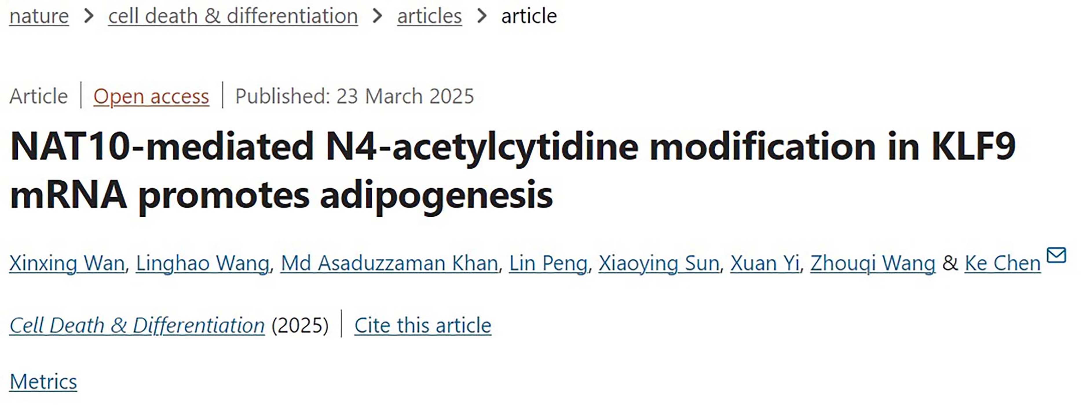 2025年3月23日,中南大学湘雅三医院内分泌科陈科副教授团队在国际权威期刊《Cell Death Differentiation》(Q1,中国科学院1区TOP期刊,IF = 13.7)以Research Article形式发表题为“NAT10-mediated N4-acetylcytidine modification in KLF9 mRNA promotes adipogenesis”(NAT10介导ac4C修饰KLF9 mRNA促进脂肪细胞分化)的原创研究论文。陈科副教授为独立通讯作者,万新星助理研究员为独立第一作者,中南大学湘雅三医院内分泌科为论文第一及通讯作者单位。