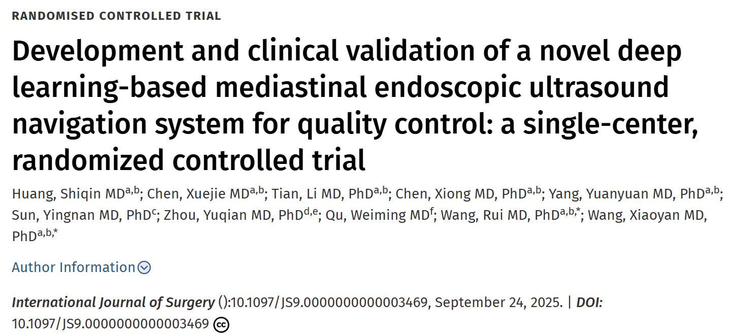 近期,中南大学湘雅三医院消化内科王晓艳教授、王瑞副研究员以共同通讯作者在国际外科学权威期刊《国际外科学杂志》(International Journal of Surgery,JCR1区,IF=10.1) 发表原创性研究论文《基于深度学习的全新纵隔超声内镜导航系统在质量控制中的开发与临床验证:一项单中心随机对照试验(Development and clinical validation of a novel deep learning-based mediastinal endoscopic ultrasound navigation system for quality control: a single-center, randomized controlled trial)》,王晓艳教授2021级博士研究生黄诗琴、消化内科青年医师陈学杰博士为共同第一作者。