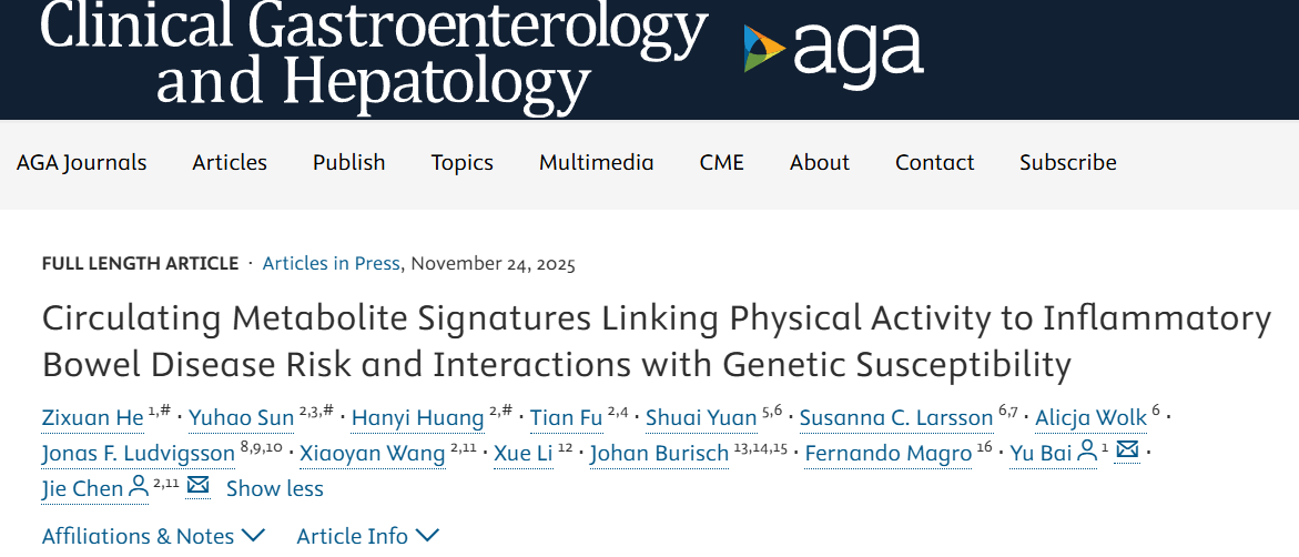 2025年11月,中南大学湘雅三医院消化内科王晓艳教授/陈杰副教授团队携手海军军医大学长海医院柏愚教授团队在国际权威期刊《临床胃肠病学和肝脏病学(Clinical Gastroenterology and Hepatology,IF=12.0,中科院一区Top)》发表原创性研究论著《代谢图谱揭示体力活动与炎症性肠病风险的关联及其与遗传易感性的交互作用(Circulating Metabolite Signatures Linking Physical Activity to Inflammatory Bowel Disease Risk and Interactions with Genetic Susceptibility)》。首次从代谢组学层面系统阐明中高强度运动(MVPA)降低炎症性肠病(IBD)风险的可能生物学途径,为IBD高危人群的精准预防提供了新方向。
